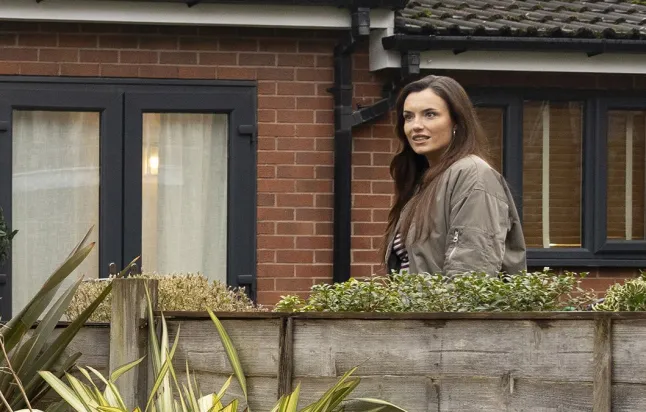 Jodie stares sinisterly over the fence at No.8 Coronation Street